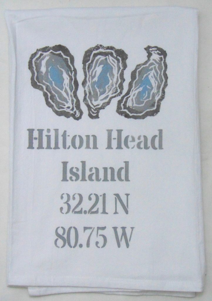 3 Oyster Shell Coordinates on white flour sack towel. Our high quality crinkled cotton is one of the most desirable fibers used for kitchen towels. 100% cotton dish towels are absorbent and don’t leave behind lint or other residue when drying dishes. We’ve designed a semi-custom full of a variety of design genres, such as, urban, coastal and pet themed flour sack towels. Consequently, you will have the luxury of selecting the paint color that is most suitable for your decor on your personalized flour sack towel. Our hand block printed cotton towels have been featured in Coastal Living Magazine, Anthropologie, Birch Lane stores and many other popular retailers.