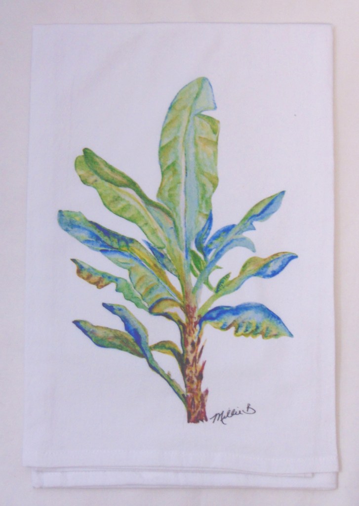 Limited edition Watercolor Banana Tree print on white flour sack towel. Our high quality crinkled cotton is one of the most desirable fibers used for kitchen towels. 100% cotton dish towels are absorbent and don’t leave behind lint or other residue when drying dishes. We’ve designed a semi-custom full of a variety of design genres, such as, urban, coastal and pet themed flour sack towels. Consequently, you will have the luxury of selecting the paint color that is most suitable for your decor on your personalized flour sack towel. Our printed cotton towels have been featured in Coastal Living Magazine, Anthropologie, Birch Lane stores and many other popular retailers.