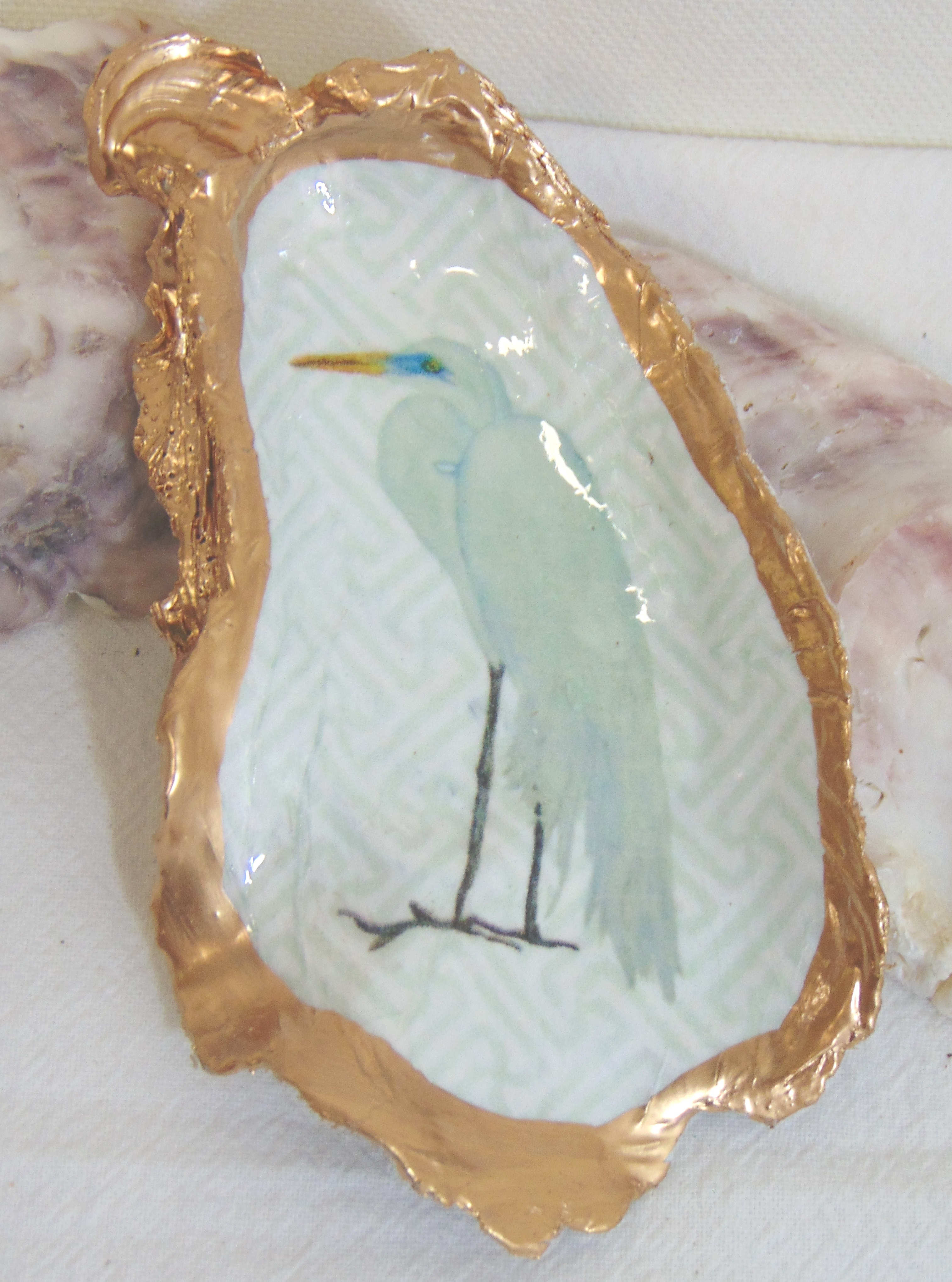 Watercolor Egret Oyster Shell Jewelry Bowl