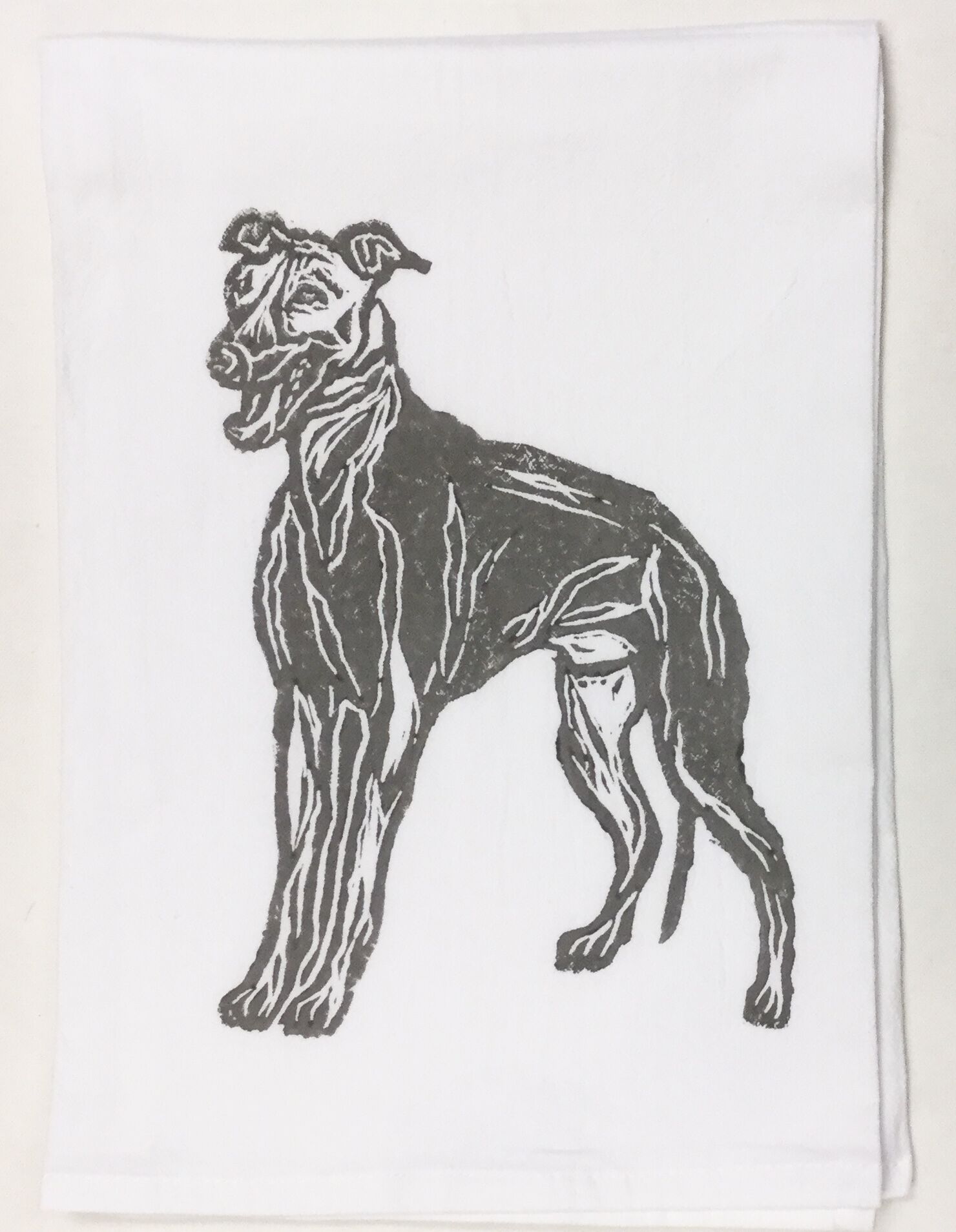 Greyhound on white flour sack towel. Our high quality crinkled cotton is one of the most desirable fibers used for kitchen towels. 100% cotton dish towels are absorbent and don’t leave behind lint or other residue when drying dishes. We’ve designed a semi-custom full of a variety of design genres, such as, urban, coastal and pet themed flour sack towels. Consequently, you will have the luxury of selecting the paint color that is most suitable for your decor on your personalized flour sack towel. Our hand block printed cotton towels have been featured in Coastal Living Magazine, Anthropologie, Birch Lane stores and many other popular retailers.
