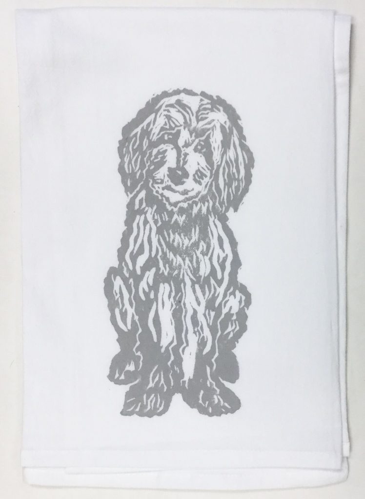 Labradoodle on white flour sack towel. Our high quality crinkled cotton is one of the most desirable fibers used for kitchen towels. 100% cotton dish towels are absorbent and don’t leave behind lint or other residue when drying dishes. We’ve designed a semi-custom full of a variety of design genres, such as, urban, coastal and pet themed flour sack towels. Consequently, you will have the luxury of selecting the paint color that is most suitable for your decor on your personalized flour sack towel. Our hand block printed cotton towels have been featured in Coastal Living Magazine, Anthropologie, Birch Lane stores and many other popular retailers.