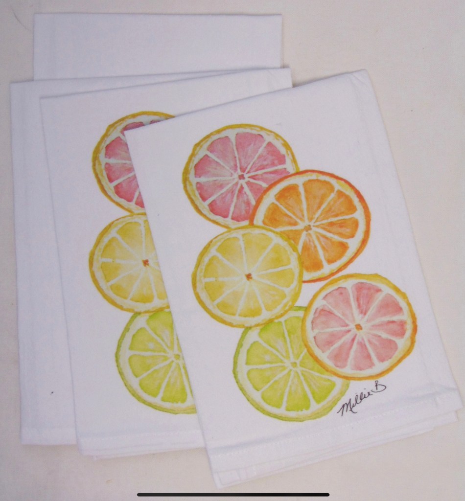 Limited edition Citrus print on white flour sack napkins. Our high quality crinkled cotton is one of the most desirable fibers used for dinner napkins. 100% cotton dinner napkins are absorbent and more so when washed. We’ve designed a semi-custom line full of a variety of design genres, such as, urban, coastal and pet themed kitchen towels. Consequently, you will have the luxury of selecting the paint color that is most suitable for your decor. Our hand block printed cotton napkins have been featured in Coastal Living magazine, Anthropologie, Birch Lane stores and many other popular retailers.