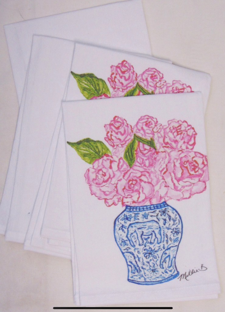 Limited edition Ginger Jar Roses print on white flour sack napkins. Our high quality crinkled cotton is one of the most desirable fibers used for dinner napkins. 100% cotton dinner napkins are absorbent and more so when washed. We’ve designed a semi-custom line full of a variety of design genres, such as, urban, coastal and pet themed kitchen towels. Consequently, you will have the luxury of selecting the paint color that is most suitable for your decor. Our hand block printed cotton napkins have been featured in Coastal Living magazine, Anthropologie, Birch Lane stores and many other popular retailers.