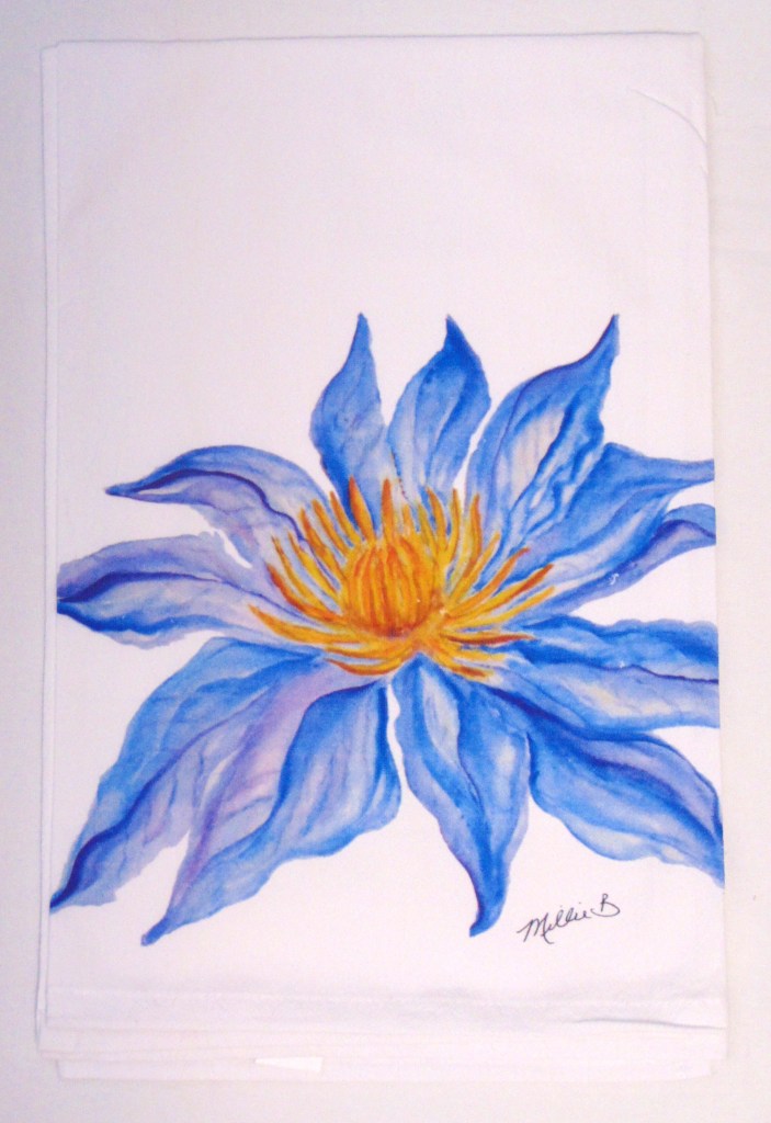 Limited edition Watercolor Water Lily print on white flour sack towel. Our high quality crinkled cotton is one of the most desirable fibers used for kitchen towels. 100% cotton dish towels are absorbent and don’t leave behind lint or other residue when drying dishes. We’ve designed a semi-custom full of a variety of design genres, such as, urban, coastal and pet themed flour sack towels. Consequently, you will have the luxury of selecting the paint color that is most suitable for your decor on your personalized flour sack towel. Our printed cotton towels have been featured in Coastal Living Magazine, Anthropologie, Birch Lane stores and many other popular retailers.
