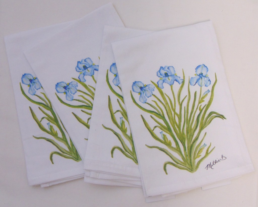 Limited edition Watercolor Blue Iris print on white flour sack napkins. Our high quality crinkled cotton is one of the most desirable fibers used for dinner napkins. 100% cotton dinner napkins are absorbent and more so when washed. We’ve designed a semi-custom line full of a variety of design genres, such as, urban, coastal and pet themed kitchen towels. Consequently, you will have the luxury of selecting the paint color that is most suitable for your decor. Our printed cotton napkins have been featured in Coastal Living magazine, Anthropologie, Birch Lane stores and many other popular retailers.