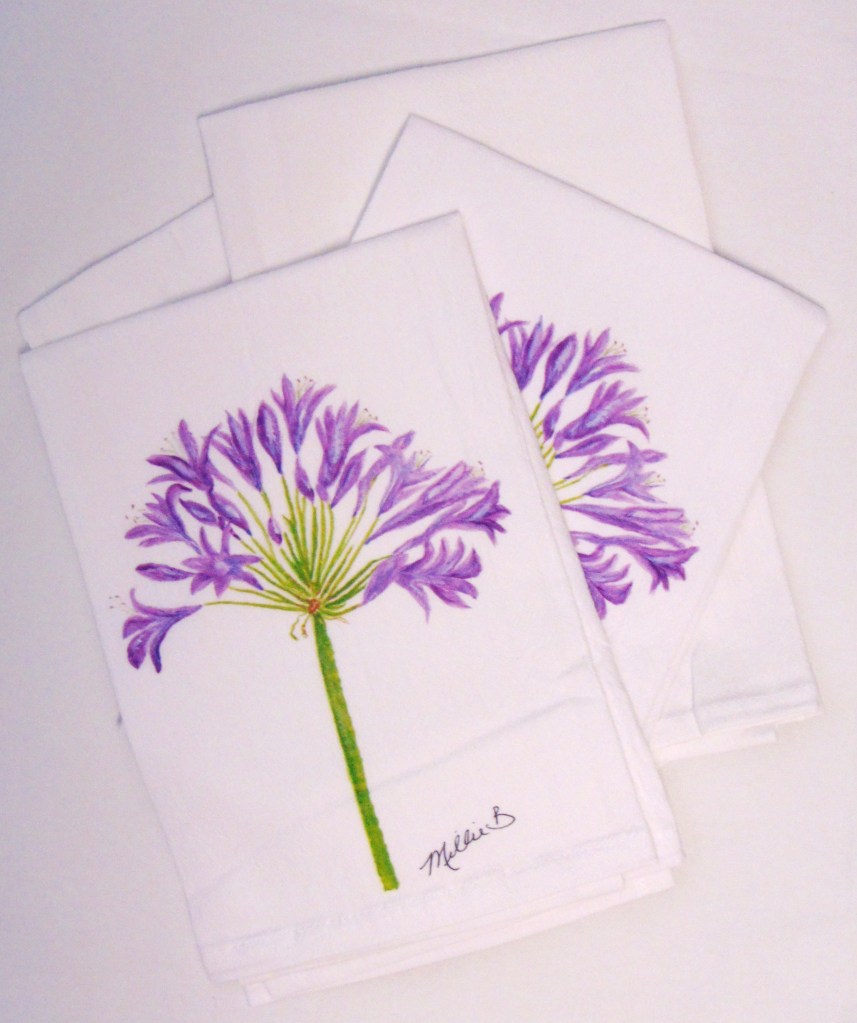Limited edition Watercolor Agapanthus print on white flour sack napkins. Our high quality crinkled cotton is one of the most desirable fibers used for dinner napkins. 100% cotton dinner napkins are absorbent and more so when washed. We’ve designed a semi-custom line full of a variety of design genres, such as, urban, coastal and pet themed kitchen towels. Consequently, you will have the luxury of selecting the paint color that is most suitable for your decor. Our printed cotton napkins have been featured in Coastal Living magazine, Anthropologie, Birch Lane stores and many other popular retailers.