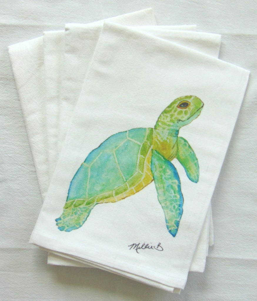 Limited edition Watercolor Aqua Sea Turtle print on white flour sack napkins. Our high quality crinkled cotton is one of the most desirable fibers used for dinner napkins. 100% cotton dinner napkins are absorbent and more so when washed. We’ve designed a semi-custom line full of a variety of design genres, such as, urban, coastal and pet themed kitchen towels. Consequently, you will have the luxury of selecting the paint color that is most suitable for your decor. Our printed cotton napkins have been featured in Coastal Living magazine, Anthropologie, Birch Lane stores and many other popular retailers.