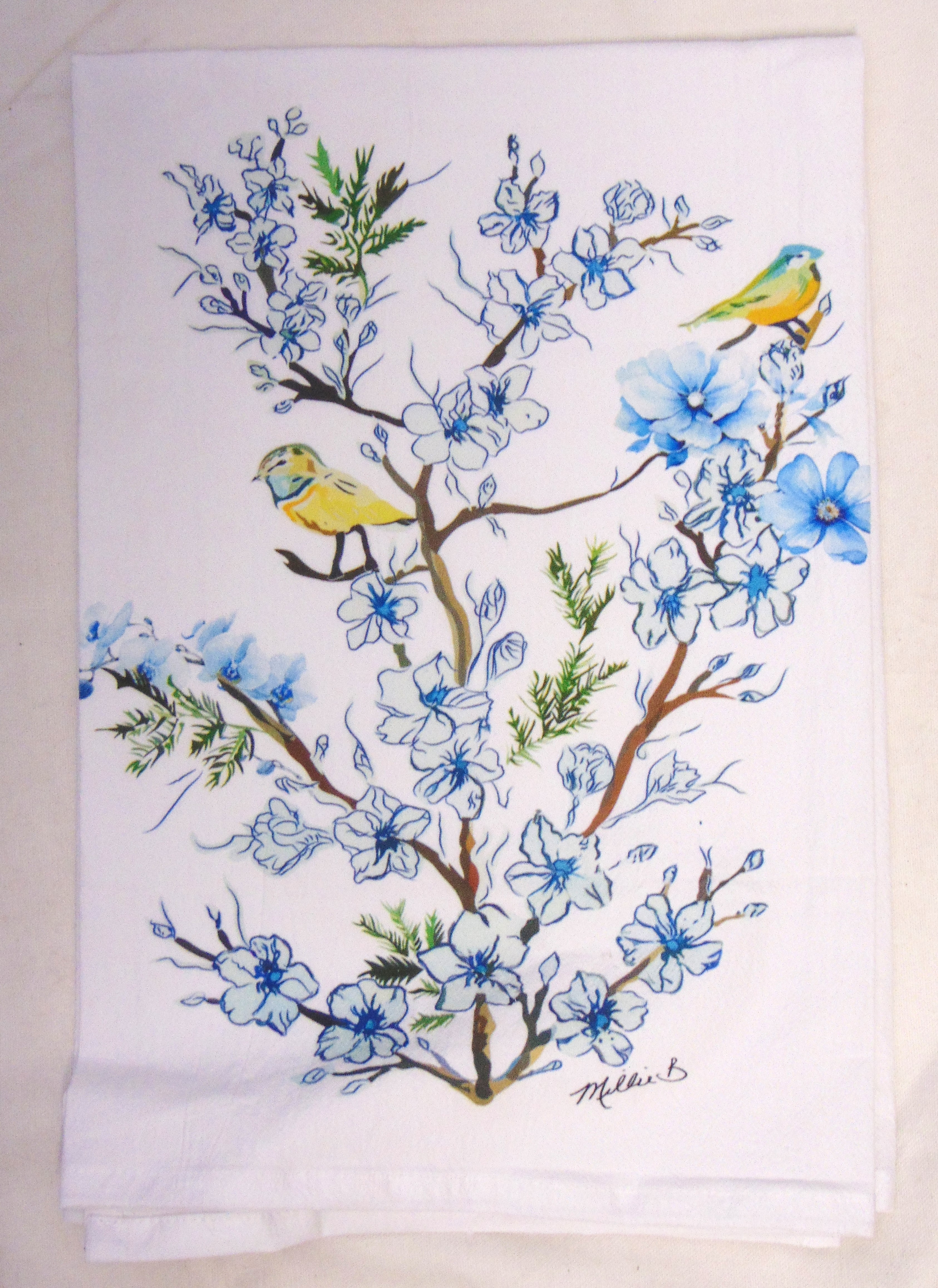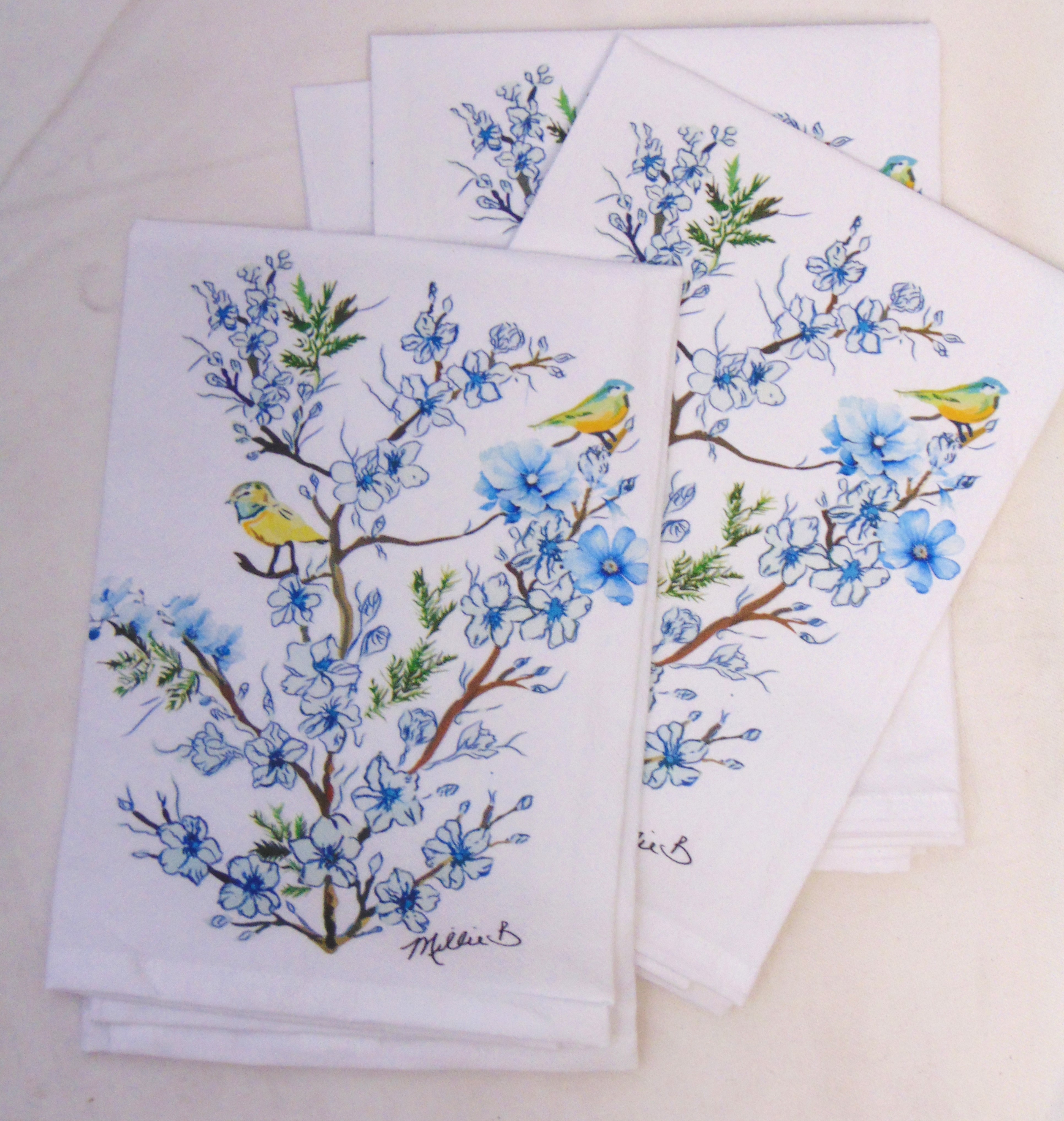 Limited edition Watercolor Battery Blossoms Blue print on white flour sack napkins. Our high quality crinkled cotton is one of the most desirable fibers used for dinner napkins. 100% cotton dinner napkins are absorbent and more so when washed. We’ve designed a semi-custom line full of a variety of design genres, such as, urban, coastal and pet themed kitchen towels. Consequently, you will have the luxury of selecting the paint color that is most suitable for your decor. Our printed cotton napkins have been featured in Coastal Living magazine, Anthropologie, Birch Lane stores and many other popular retailers.