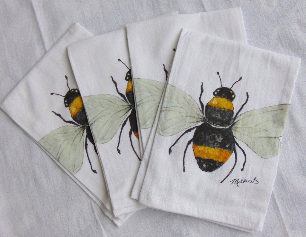 Limited edition Watercolor Bee print on white flour sack napkins. Our high quality crinkled cotton is one of the most desirable fibers used for dinner napkins. 100% cotton dinner napkins are absorbent and more so when washed. We’ve designed a semi-custom line full of a variety of design genres, such as, urban, coastal and pet themed kitchen towels. Consequently, you will have the luxury of selecting the paint color that is most suitable for your decor. Our printed cotton napkins have been featured in Coastal Living magazine, Anthropologie, Birch Lane stores and many other popular retailers.
