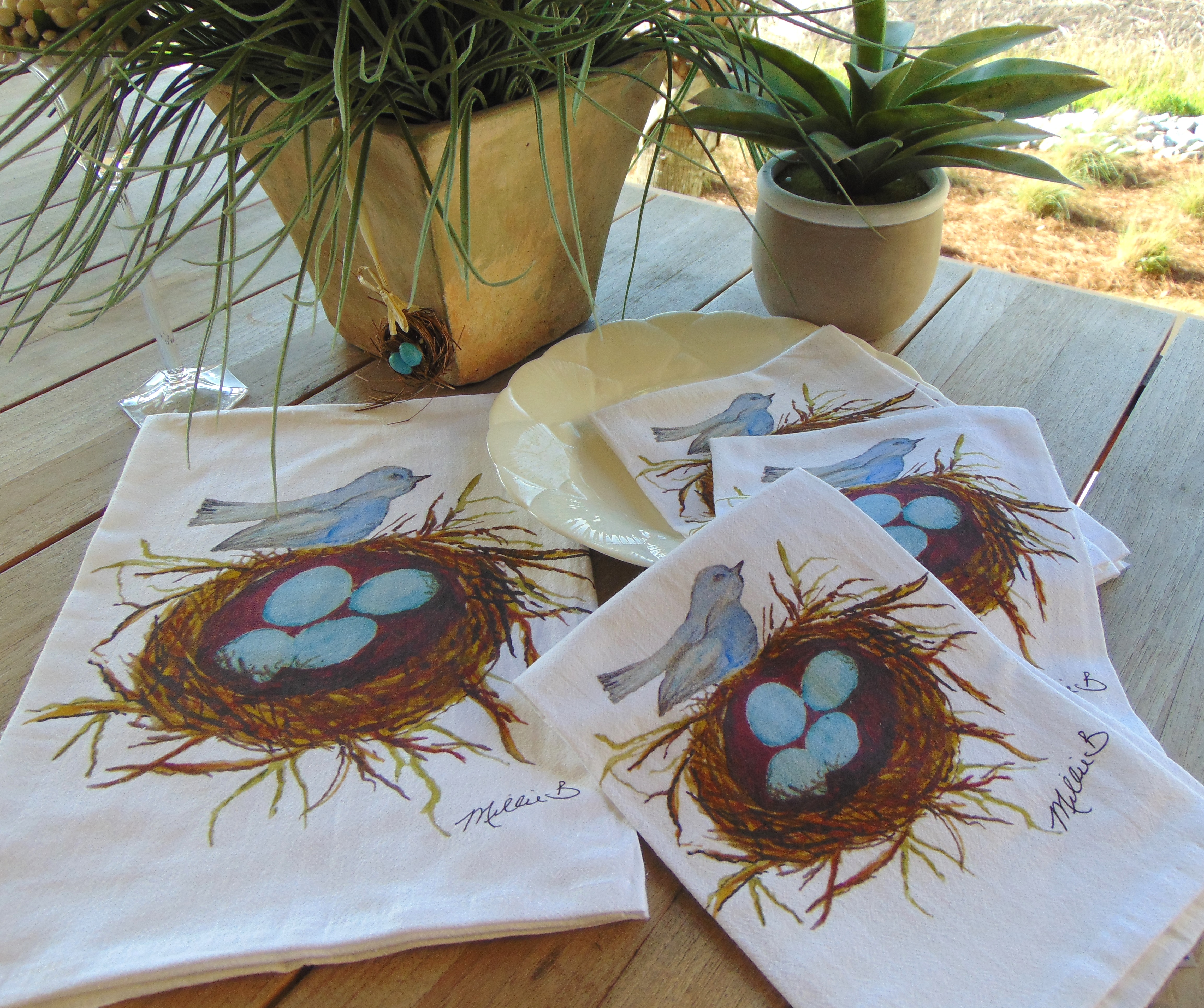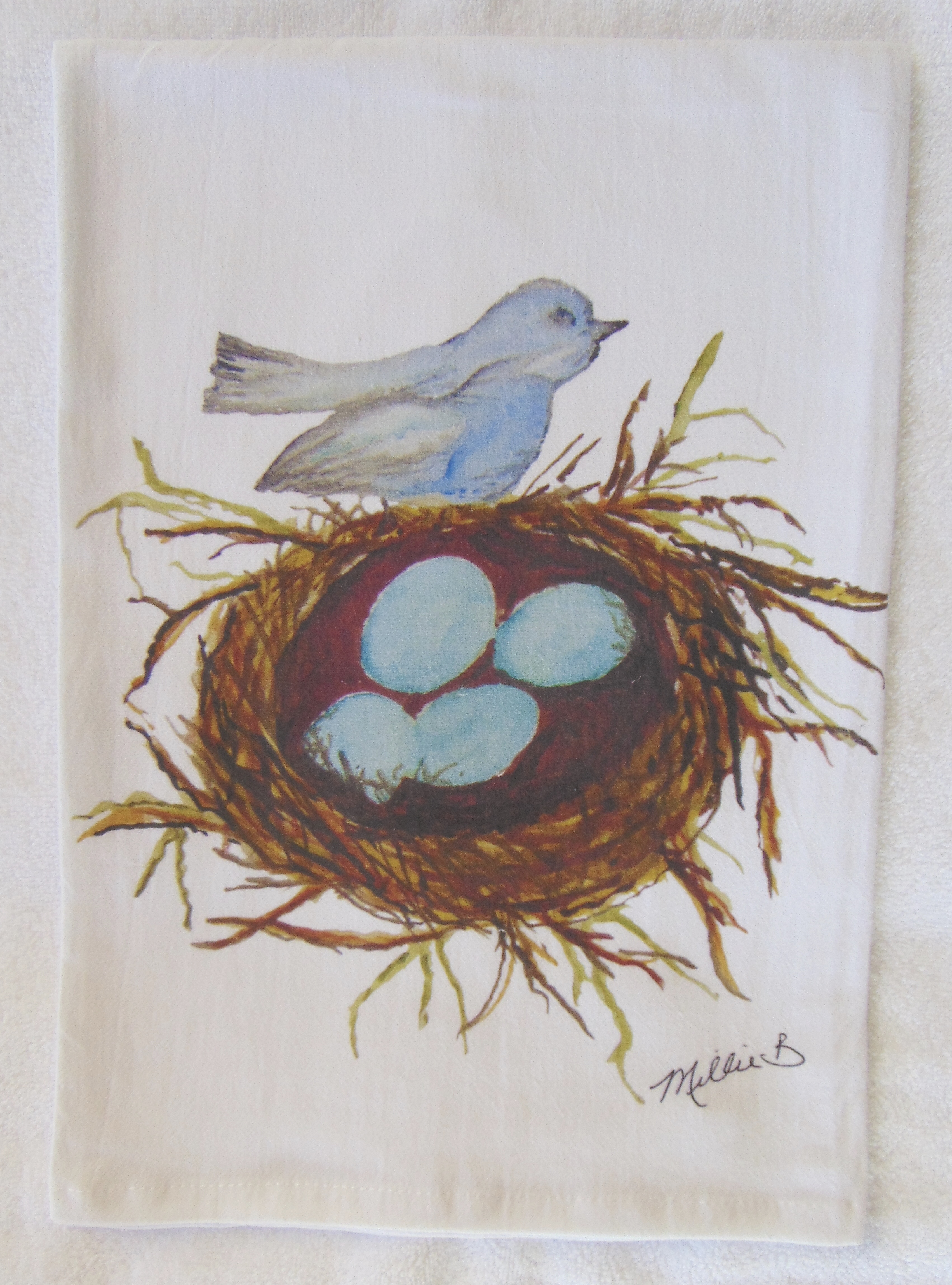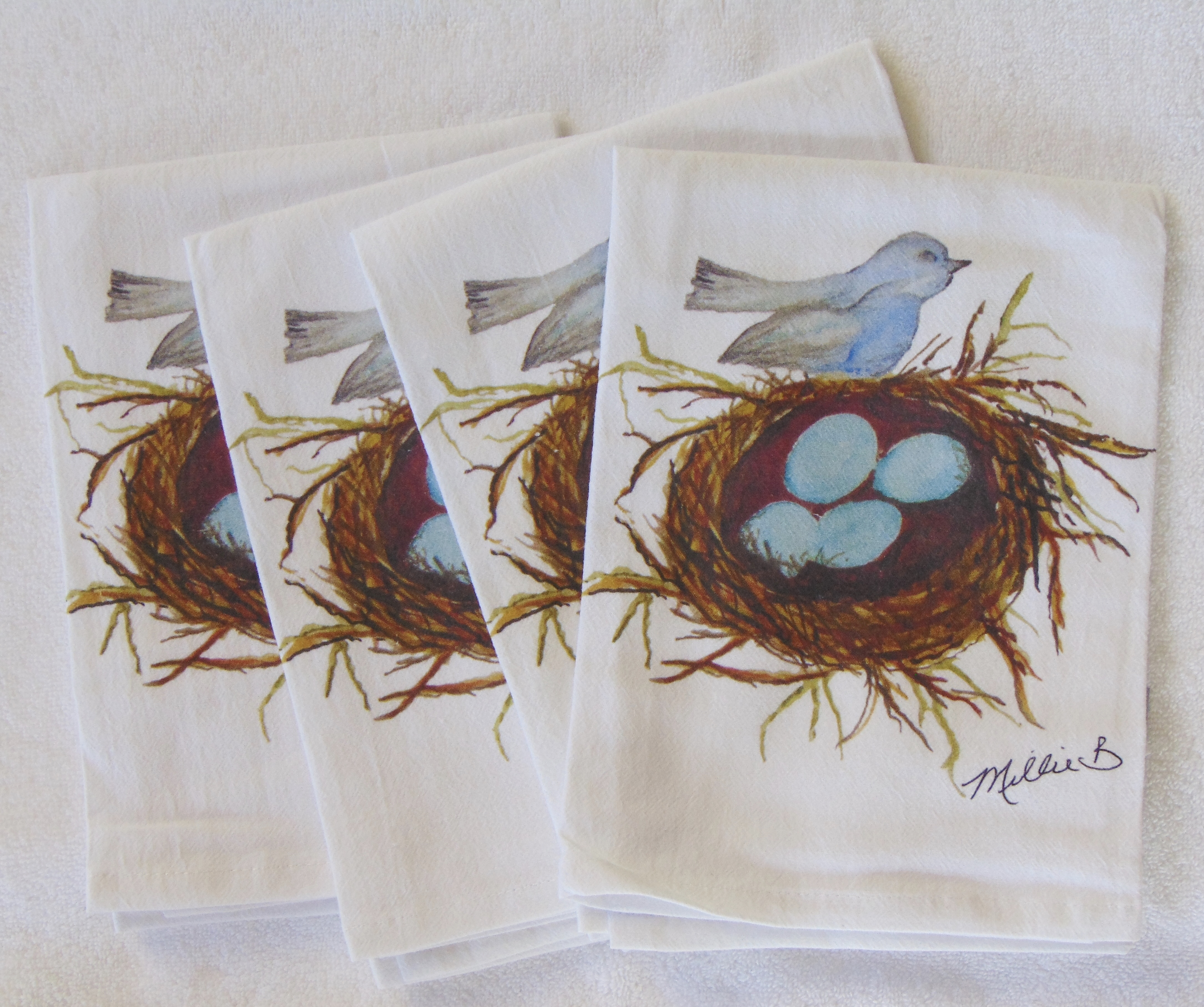 Limited edition Watercolor Birds Nest print on white flour sack towel. Our high quality crinkled cotton is one of the most desirable fibers used for kitchen towels. 100% cotton dish towels are absorbent and don’t leave behind lint or other residue when drying dishes. We’ve designed a semi-custom full of a variety of design genres, such as, urban, coastal and pet themed flour sack towels. Consequently, you will have the luxury of selecting the paint color that is most suitable for your decor on your personalized flour sack towel. Our printed cotton towels have been featured in Coastal Living Magazine, Anthropologie, Birch Lane stores and many other popular retailers.