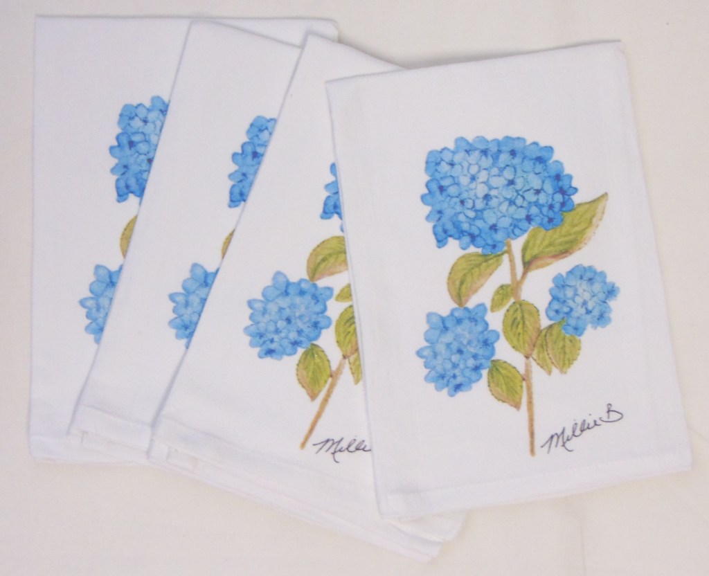 Limited edition Watercolor Blue Hydrangeas print on white flour sack napkins. Our high quality crinkled cotton is one of the most desirable fibers used for dinner napkins. 100% cotton dinner napkins are absorbent and more so when washed. We’ve designed a semi-custom line full of a variety of design genres, such as, urban, coastal and pet themed kitchen towels. Consequently, you will have the luxury of selecting the paint color that is most suitable for your decor. Our printed cotton napkins have been featured in Coastal Living magazine, Anthropologie, Birch Lane stores and many other popular retailers.