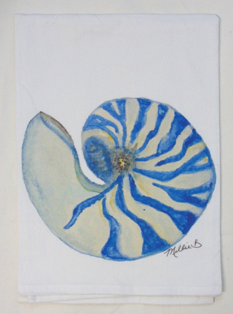 Limited edition Watercolor Blue Nautilus print on white flour sack towel. Our high quality crinkled cotton is one of the most desirable fibers used for kitchen towels. 100% cotton dish towels are absorbent and don’t leave behind lint or other residue when drying dishes. We’ve designed a semi-custom full of a variety of design genres, such as, urban, coastal and pet themed flour sack towels. Consequently, you will have the luxury of selecting the paint color that is most suitable for your decor on your personalized flour sack towel. Our hand block printed cotton towels have been featured in Coastal Living Magazine, Anthropologie, Birch Lane stores and many other popular retailers.