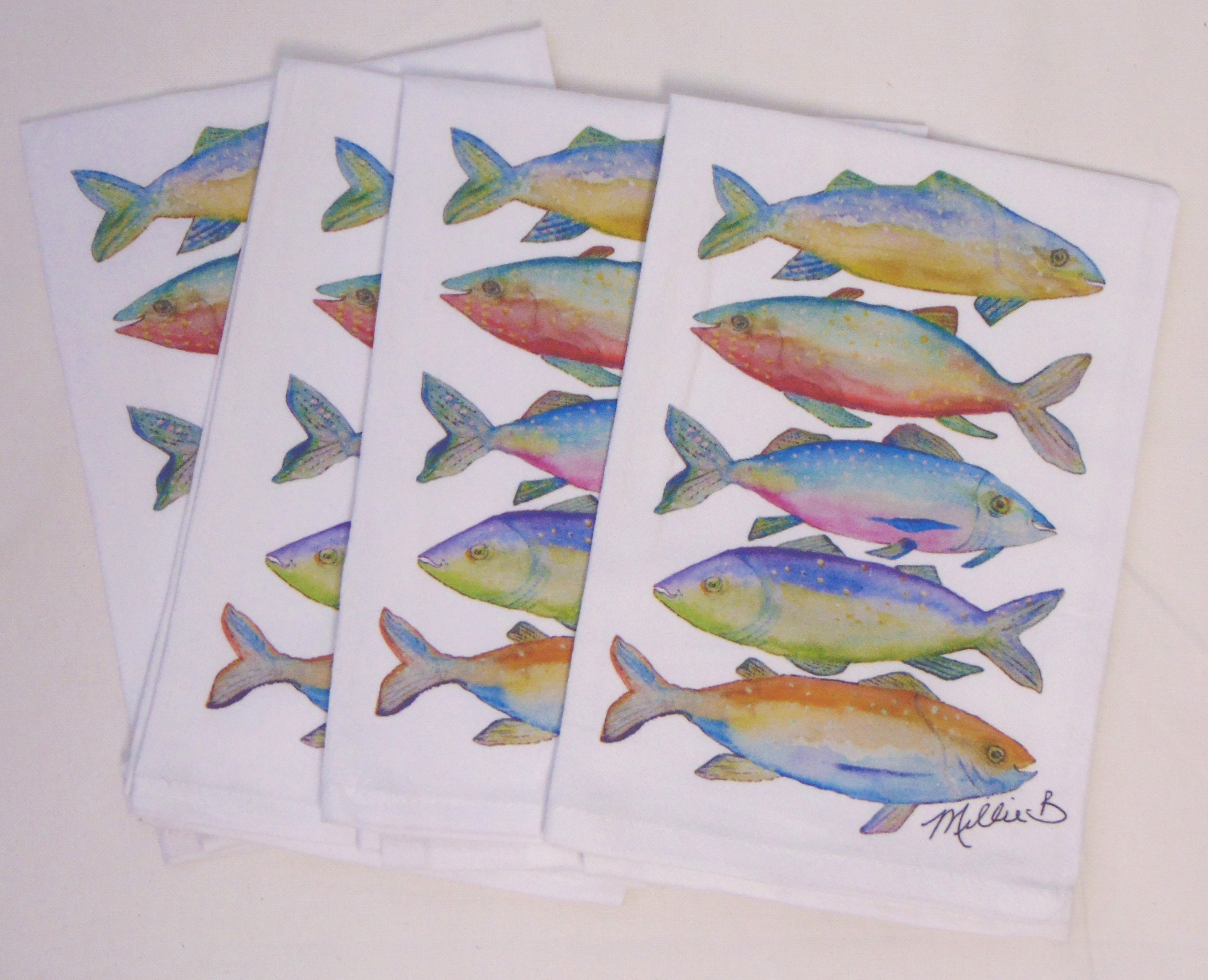 Limited Edition Watercolor Fishies Print White Flour Sack Napkins