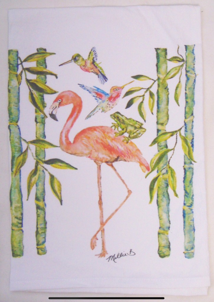 Limited edition Watercolor Flamingo Party print on white flour sack towel. Our high quality crinkled cotton is one of the most desirable fibers used for kitchen towels. 100% cotton dish towels are absorbent and don’t leave behind lint or other residue when drying dishes. We’ve designed a semi-custom full of a variety of design genres, such as, urban, coastal and pet themed flour sack towels. Consequently, you will have the luxury of selecting the paint color that is most suitable for your decor on your personalized flour sack towel. Our printed cotton towels have been featured in Coastal Living Magazine, Anthropologie, Birch Lane stores and many other popular retailers.