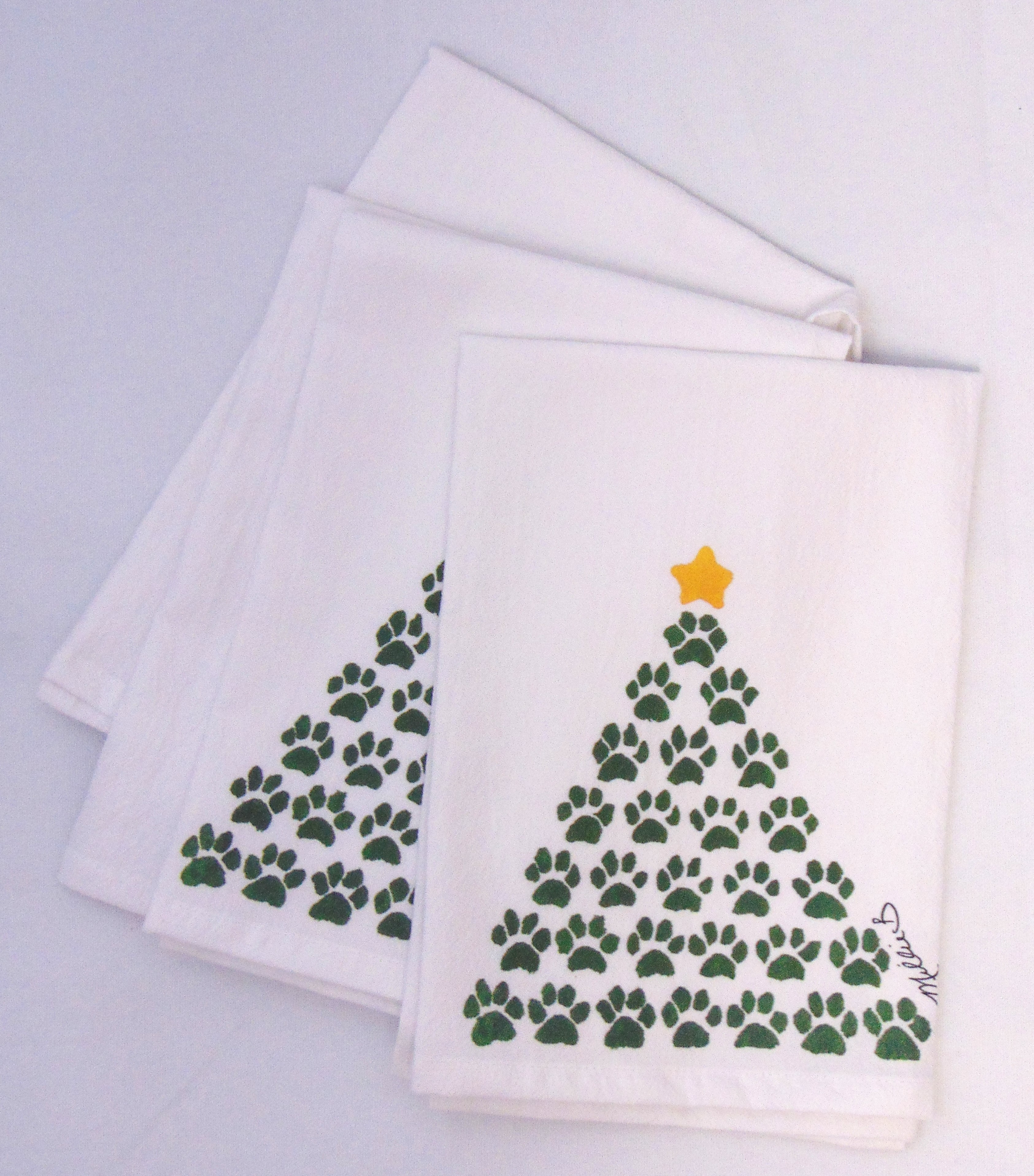 Limited edition Watercolor Green Paw Tree print on white flour sack napkins. Our high quality crinkled cotton is one of the most desirable fibers used for dinner napkins. 100% cotton dinner napkins are absorbent and more so when washed. We’ve designed a semi-custom line full of a variety of design genres, such as, urban, coastal and pet themed kitchen towels. Consequently, you will have the luxury of selecting the paint color that is most suitable for your decor. Our printed cotton napkins have been featured in Coastal Living magazine, Anthropologie, Birch Lane stores and many other popular retailers.