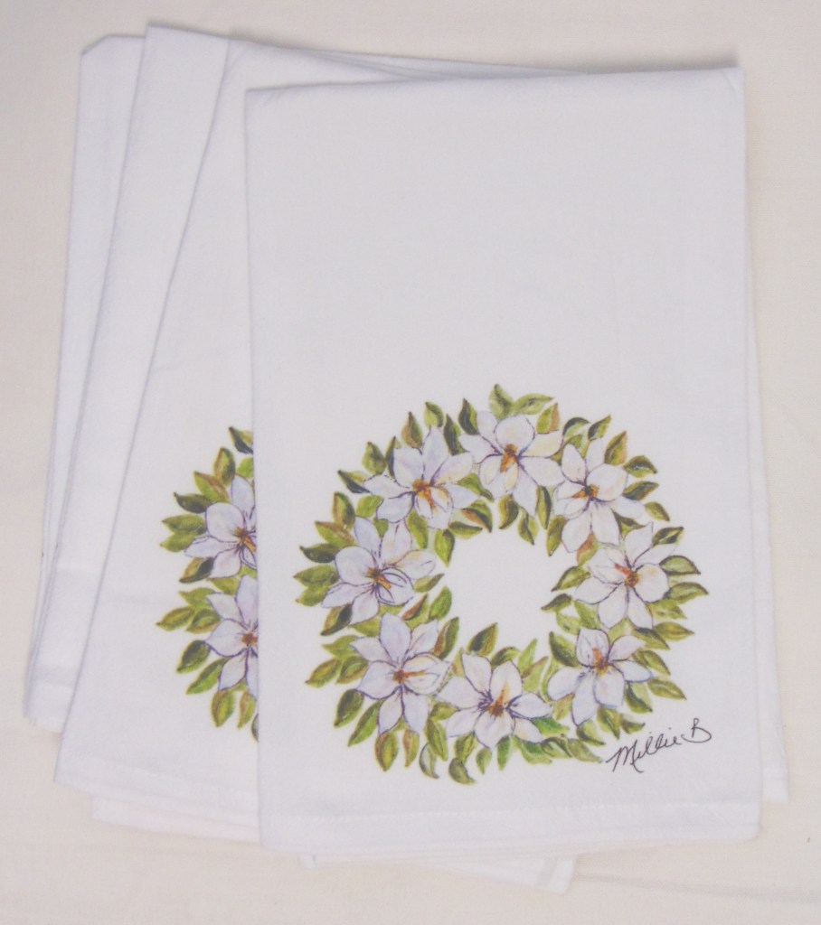 Limited edition Watercolor Magnolia Wreath print on white flour sack napkins. Our high quality crinkled cotton is one of the most desirable fibers used for dinner napkins. 100% cotton dinner napkins are absorbent and more so when washed. We’ve designed a semi-custom line full of a variety of design genres, such as, urban, coastal and pet themed kitchen towels. Consequently, you will have the luxury of selecting the paint color that is most suitable for your decor. Our printed cotton napkins have been featured in Coastal Living magazine, Anthropologie, Birch Lane stores and many other popular retailers.
