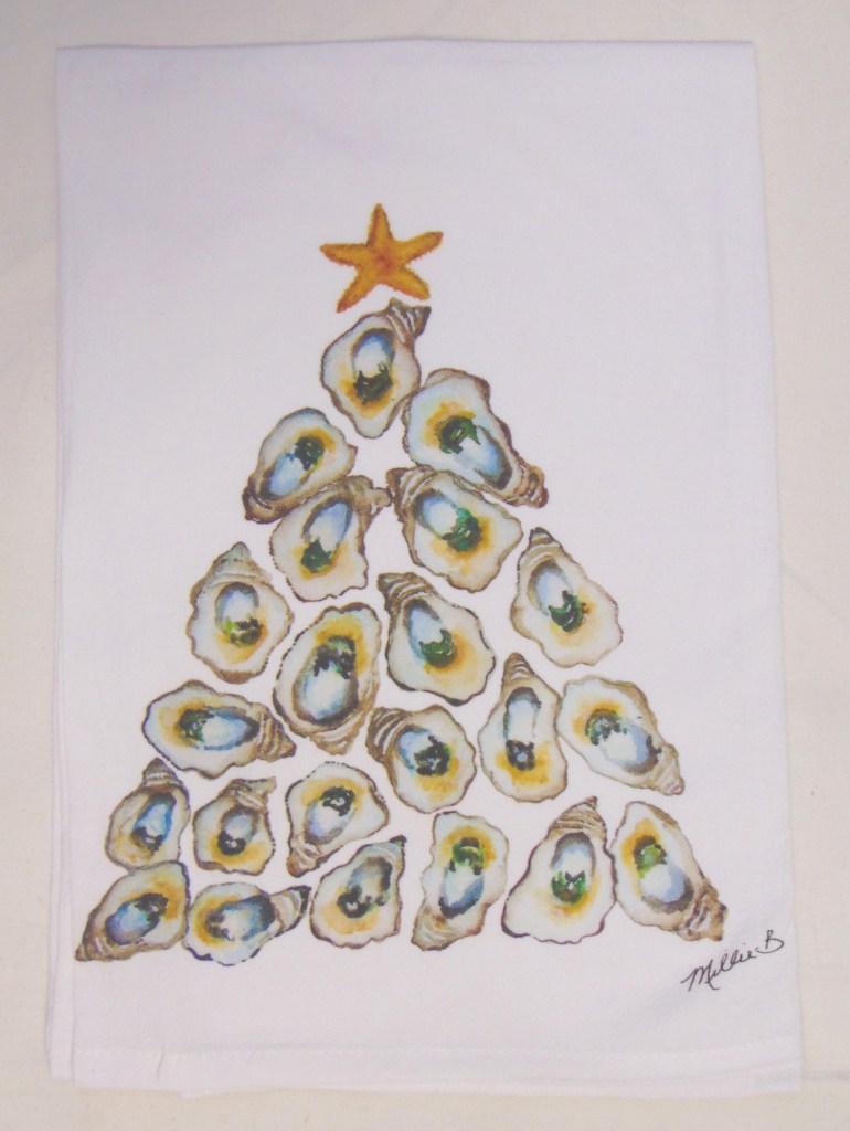 Limited edition Watercolor Oyster Shell Tree print on white flour sack towel. Our high quality crinkled cotton is one of the most desirable fibers used for kitchen towels. 100% cotton dish towels are absorbent and don’t leave behind lint or other residue when drying dishes. We’ve designed a semi-custom full of a variety of design genres, such as, urban, coastal and pet themed flour sack towels. Consequently, you will have the luxury of selecting the paint color that is most suitable for your decor on your personalized flour sack towel. Our printed cotton towels have been featured in Coastal Living Magazine, Anthropologie, Birch Lane stores and many other popular retailers.