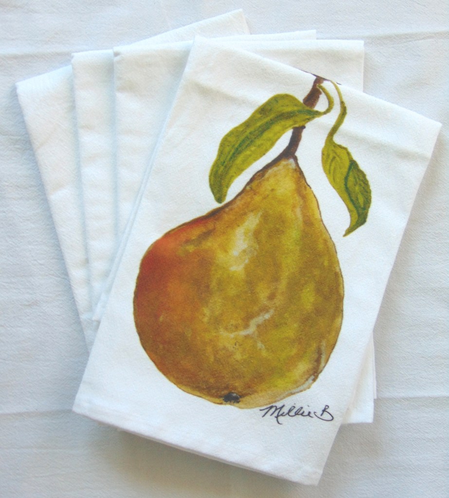 Limited edition Watercolor Pear print on white flour sack napkins. Our high quality crinkled cotton is one of the most desirable fibers used for dinner napkins. 100% cotton dinner napkins are absorbent and more so when washed. We’ve designed a semi-custom line full of a variety of design genres, such as, urban, coastal and pet themed kitchen towels. Consequently, you will have the luxury of selecting the paint color that is most suitable for your decor. Our printed cotton napkins have been featured in Coastal Living magazine, Anthropologie, Birch Lane stores and many other popular retailers.