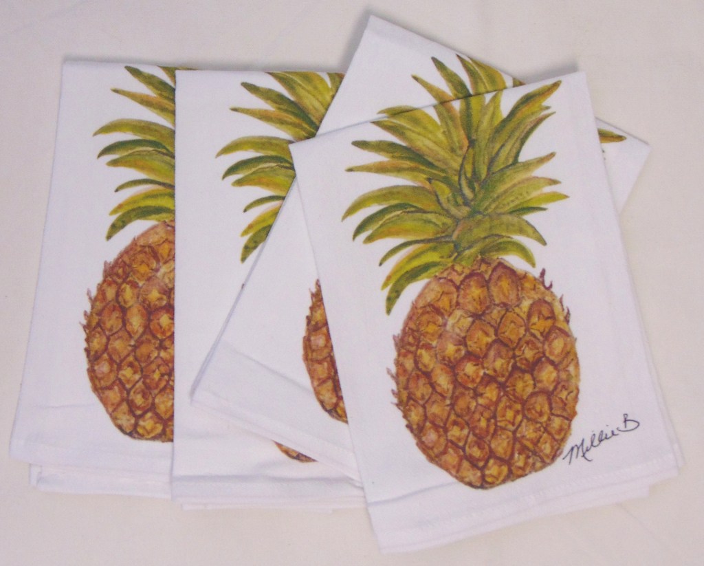 Limited edition Watercolor Pineapple print on white flour sack napkins. Our high quality crinkled cotton is one of the most desirable fibers used for dinner napkins. 100% cotton dinner napkins are absorbent and more so when washed. We’ve designed a semi-custom line full of a variety of design genres, such as, urban, coastal and pet themed kitchen towels. Consequently, you will have the luxury of selecting the paint color that is most suitable for your decor. Our printed cotton napkins have been featured in Coastal Living magazine, Anthropologie, Birch Lane stores and many other popular retailers.