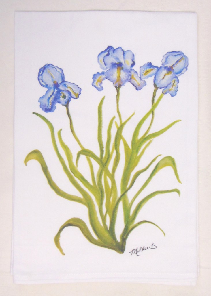 Limited edition Watercolor Purple Iris print on white flour sack towel. Our high quality crinkled cotton is one of the most desirable fibers used for kitchen towels. 100% cotton dish towels are absorbent and don’t leave behind lint or other residue when drying dishes. We’ve designed a semi-custom full of a variety of design genres, such as, urban, coastal and pet themed flour sack towels. Consequently, you will have the luxury of selecting the paint color that is most suitable for your decor on your personalized flour sack towel. Our printed cotton towels have been featured in Coastal Living Magazine, Anthropologie, Birch Lane stores and many other popular retailers.