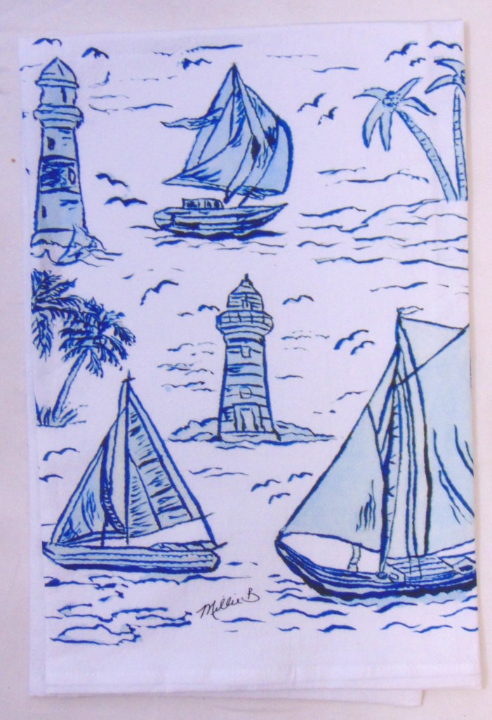 Limited edition Watercolor Sailboat Toile print on white flour sack towel. Our high quality crinkled cotton is one of the most desirable fibers used for kitchen towels. 100% cotton dish towels are absorbent and don’t leave behind lint or other residue when drying dishes. We’ve designed a semi-custom full of a variety of design genres, such as, urban, coastal and pet themed flour sack towels. Consequently, you will have the luxury of selecting the paint color that is most suitable for your decor on your personalized flour sack towel. Our printed cotton towels have been featured in Coastal Living Magazine, Anthropologie, Birch Lane stores and many other popular retailers.