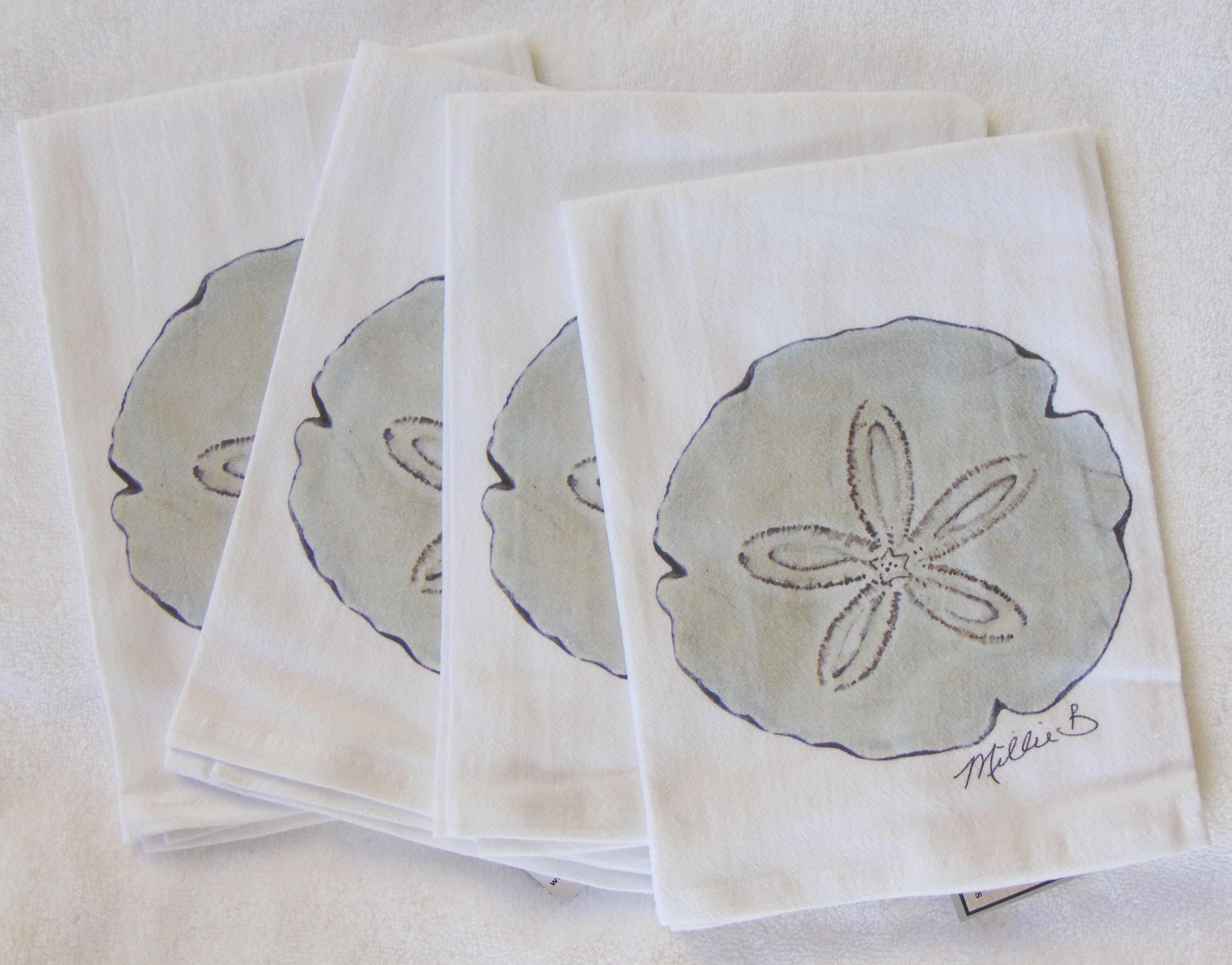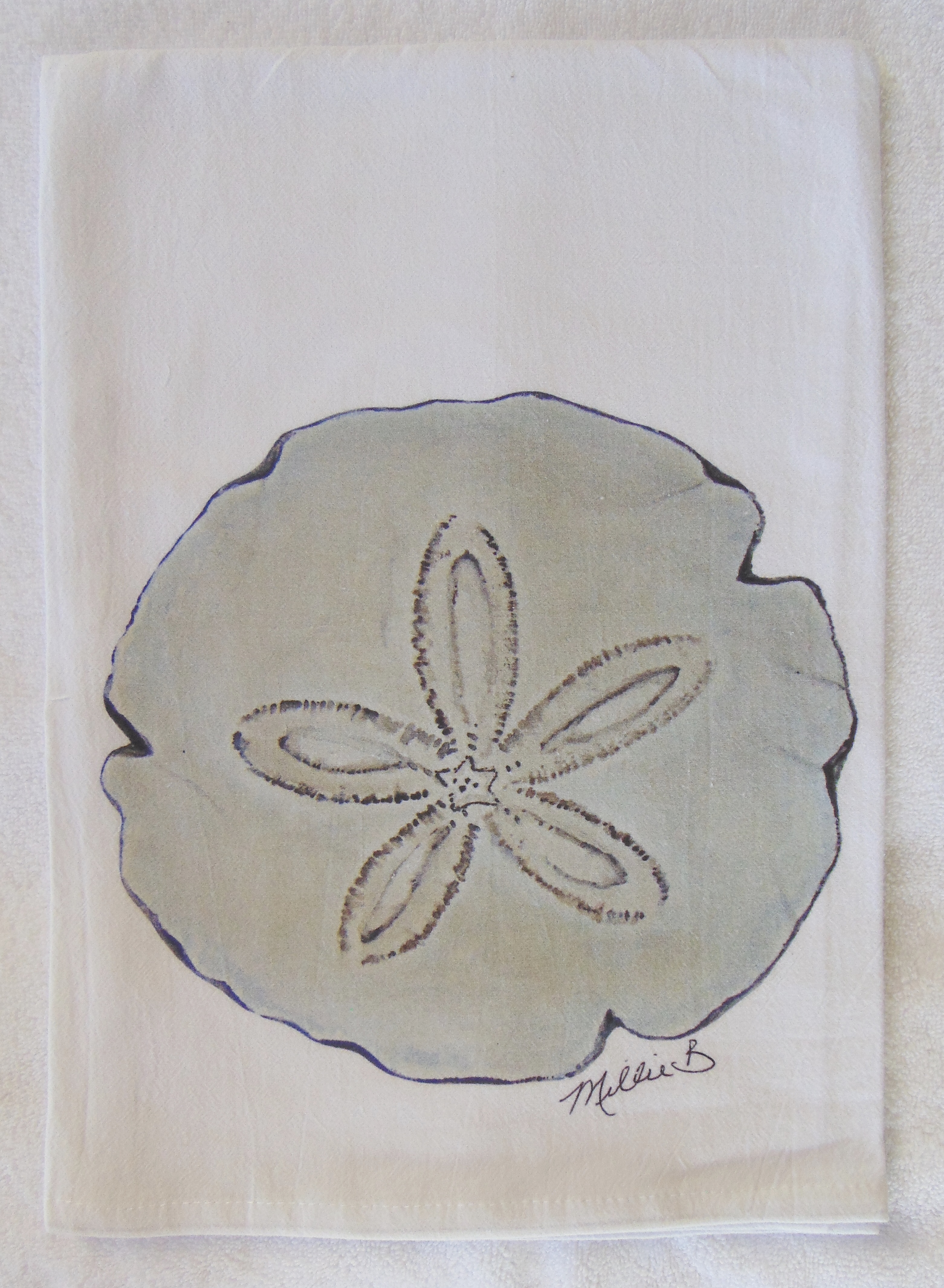 Limited edition Watercolor Sand Dollar print on white flour sack towel. Our high quality crinkled cotton is one of the most desirable fibers used for kitchen towels. 100% cotton dish towels are absorbent and don’t leave behind lint or other residue when drying dishes. We’ve designed a semi-custom full of a variety of design genres, such as, urban, coastal and pet themed flour sack towels. Consequently, you will have the luxury of selecting the paint color that is most suitable for your decor on your personalized flour sack towel. Our printed cotton towels have been featured in Coastal Living Magazine, Anthropologie, Birch Lane stores and many other popular retailers.