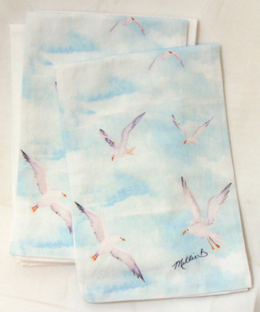 Limited edition Watercolor Seagulls print on white flour sack napkins. Our high quality crinkled cotton is one of the most desirable fibers used for dinner napkins. 100% cotton dinner napkins are absorbent and more so when washed. We’ve designed a semi-custom line full of a variety of design genres, such as, urban, coastal and pet themed kitchen towels. Consequently, you will have the luxury of selecting the paint color that is most suitable for your decor. Our printed cotton napkins have been featured in Coastal Living magazine, Anthropologie, Birch Lane stores and many other popular retailers.
