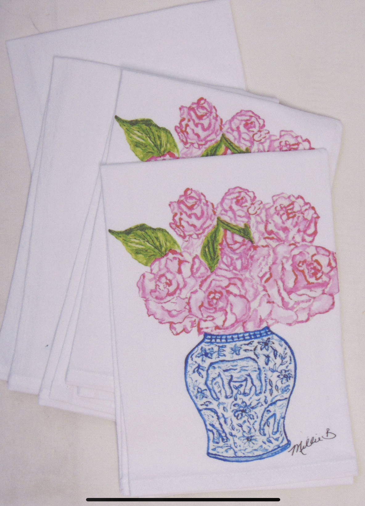 Limited edition Watercolor Ginger Jar Roses print on white flour sack towel. Our high quality crinkled cotton is one of the most desirable fibers used for kitchen towels. 100% cotton dish towels are absorbent and don’t leave behind lint or other residue when drying dishes. We’ve designed a semi-custom full of a variety of design genres, such as, urban, coastal and pet themed flour sack towels. Consequently, you will have the luxury of selecting the paint color that is most suitable for your decor on your personalized flour sack towel. Our printed cotton towels have been featured in Coastal Living Magazine, Anthropologie, Birch Lane stores and many other popular retailers.
