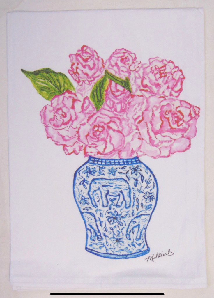 Limited edition Watercolor Ginger Jar Roses print on white flour sack towel. Our high quality crinkled cotton is one of the most desirable fibers used for kitchen towels. 100% cotton dish towels are absorbent and don’t leave behind lint or other residue when drying dishes. We’ve designed a semi-custom full of a variety of design genres, such as, urban, coastal and pet themed flour sack towels. Consequently, you will have the luxury of selecting the paint color that is most suitable for your decor on your personalized flour sack towel. Our printed cotton towels have been featured in Coastal Living Magazine, Anthropologie, Birch Lane stores and many other popular retailers.