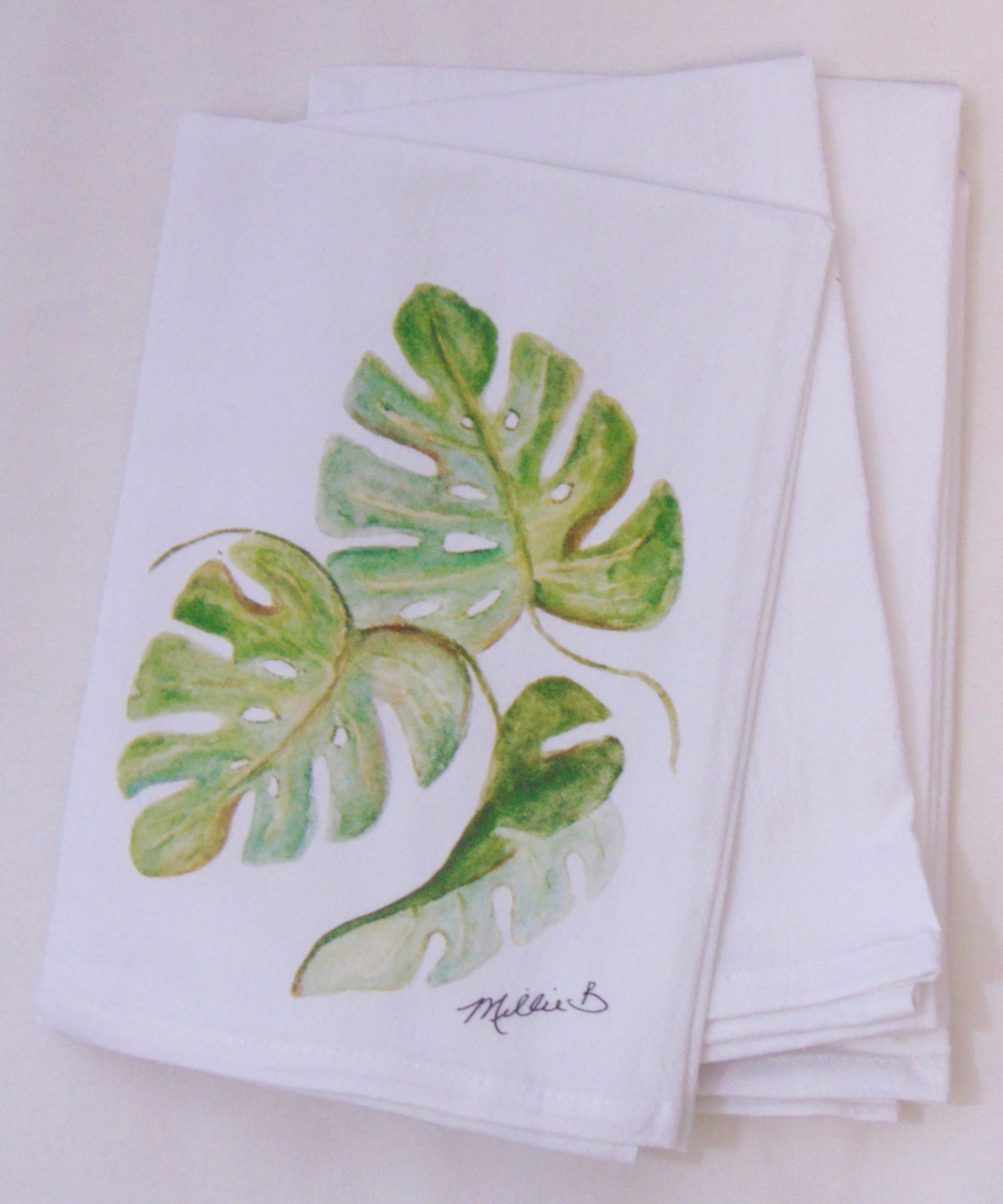 Limited Edition Watercolor Monstera Print White Flour Sack Napkin