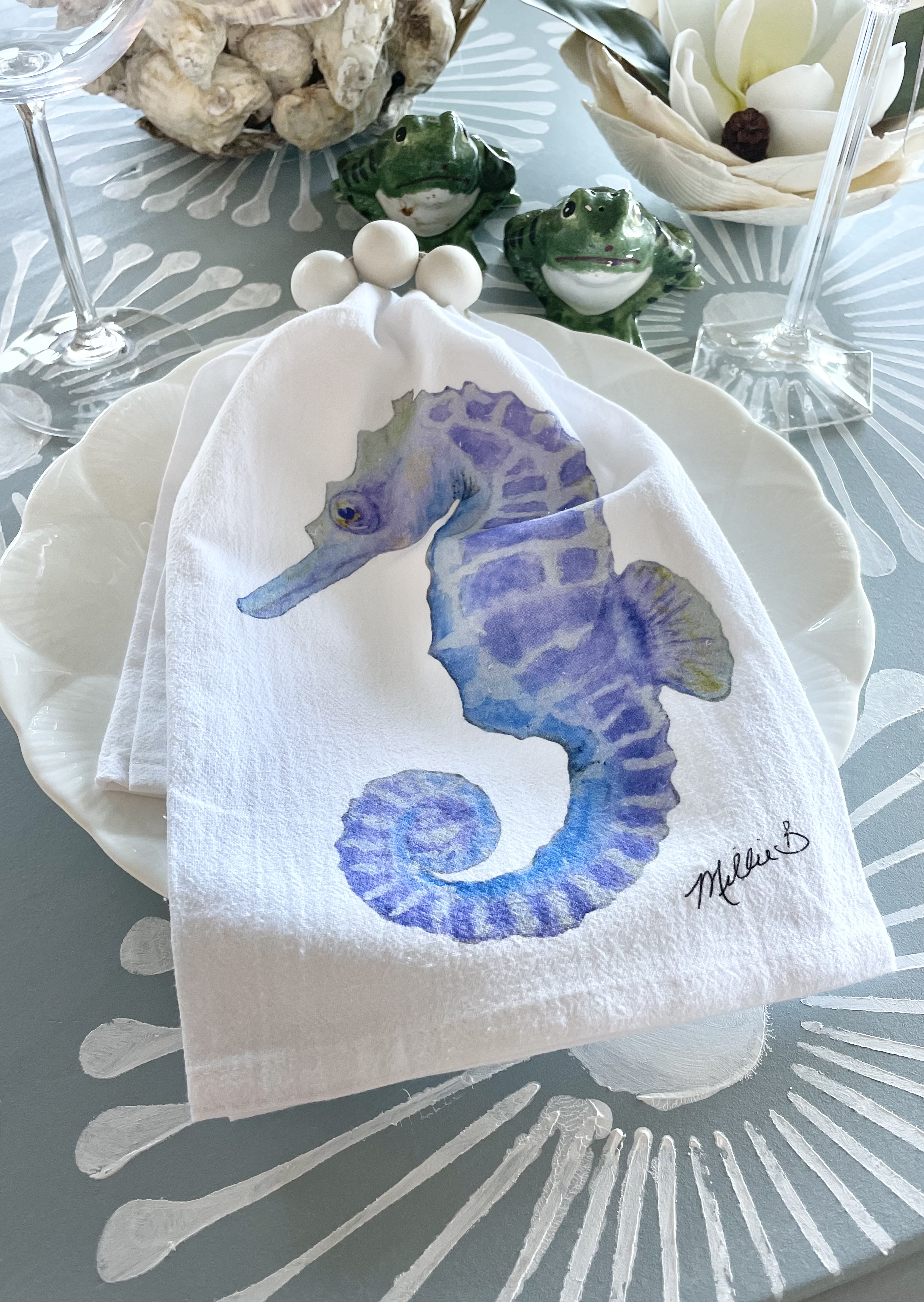 Limited Edition Watercolor 3 Oysters Print White Flour Sack Napkins