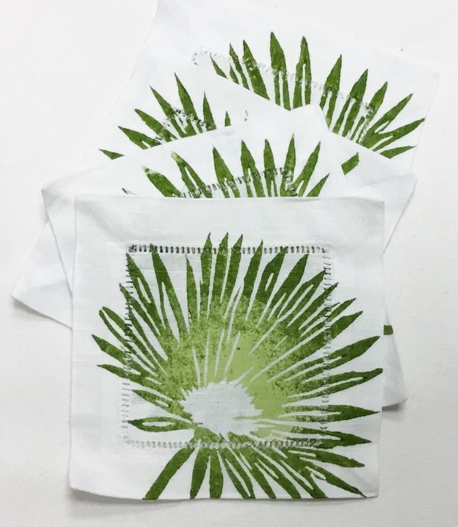 Palm Frond (Two-toned Green) on White Linen Cocktail Napkins