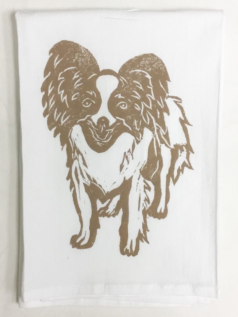 Papillon on white flour sack towel. Our high quality crinkled cotton is one of the most desirable fibers used for kitchen towels. 100% cotton dish towels are absorbent and don’t leave behind lint or other residue when drying dishes. We’ve designed a semi-custom full of a variety of design genres, such as, urban, coastal and pet themed flour sack towels. Consequently, you will have the luxury of selecting the paint color that is most suitable for your decor on your personalized flour sack towel. Our hand block printed cotton towels have been featured in Coastal Living Magazine, Anthropologie, Birch Lane stores and many other popular retailers.