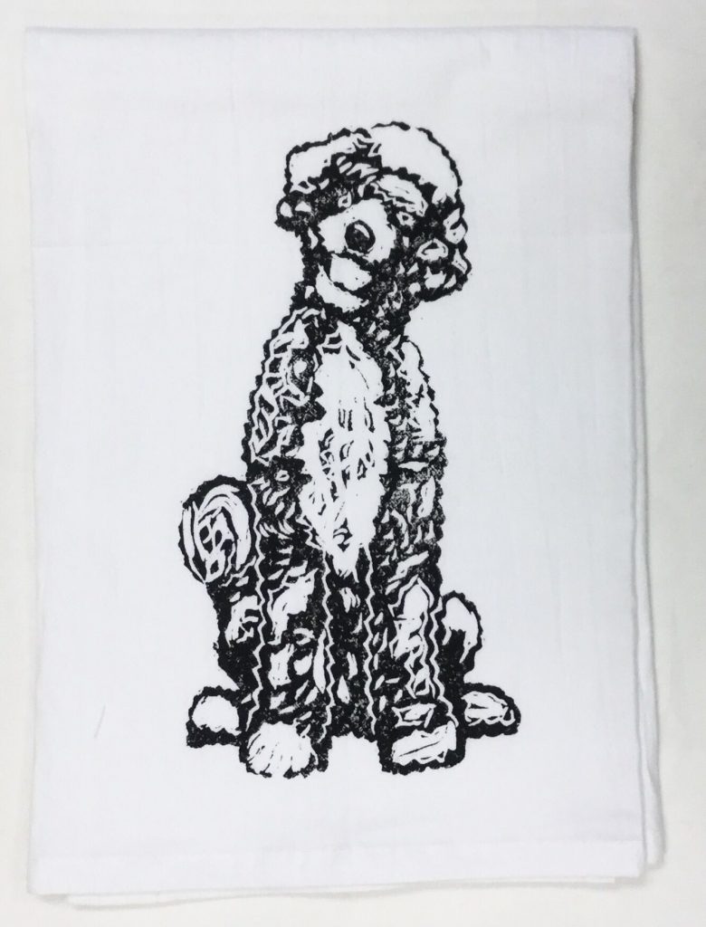 Portuguese Waterdog on white flour sack towel. Our high quality crinkled cotton is one of the most desirable fibers used for kitchen towels. 100% cotton dish towels are absorbent and don’t leave behind lint or other residue when drying dishes. We’ve designed a semi-custom full of a variety of design genres, such as, urban, coastal and pet themed flour sack towels. Consequently, you will have the luxury of selecting the paint color that is most suitable for your decor on your personalized flour sack towel. Our hand block printed cotton towels have been featured in Coastal Living Magazine, Anthropologie, Birch Lane stores and many other popular retailers.