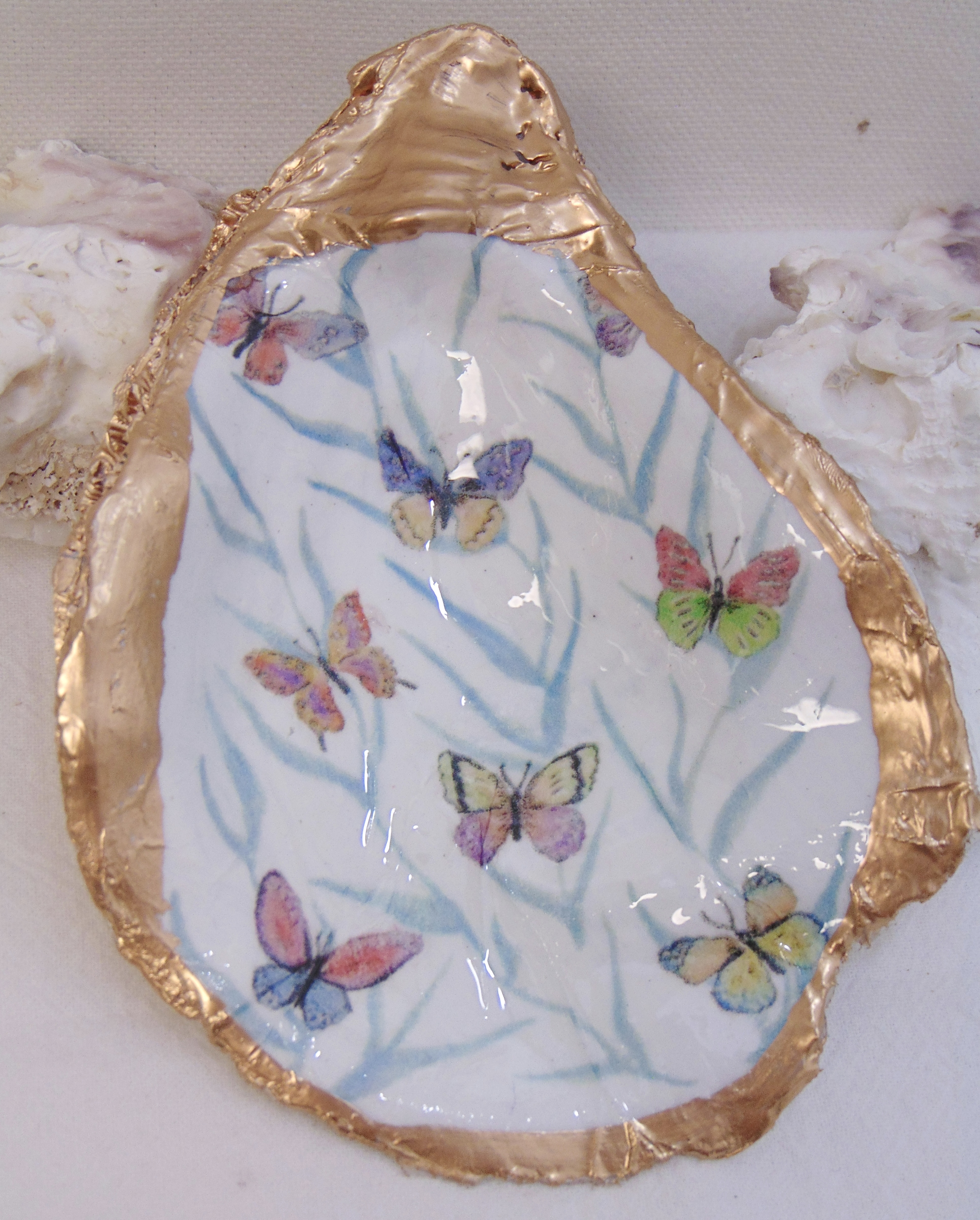 Watercolor Aqua Butterfly Garden Oyster Shell Jewelry Bowl