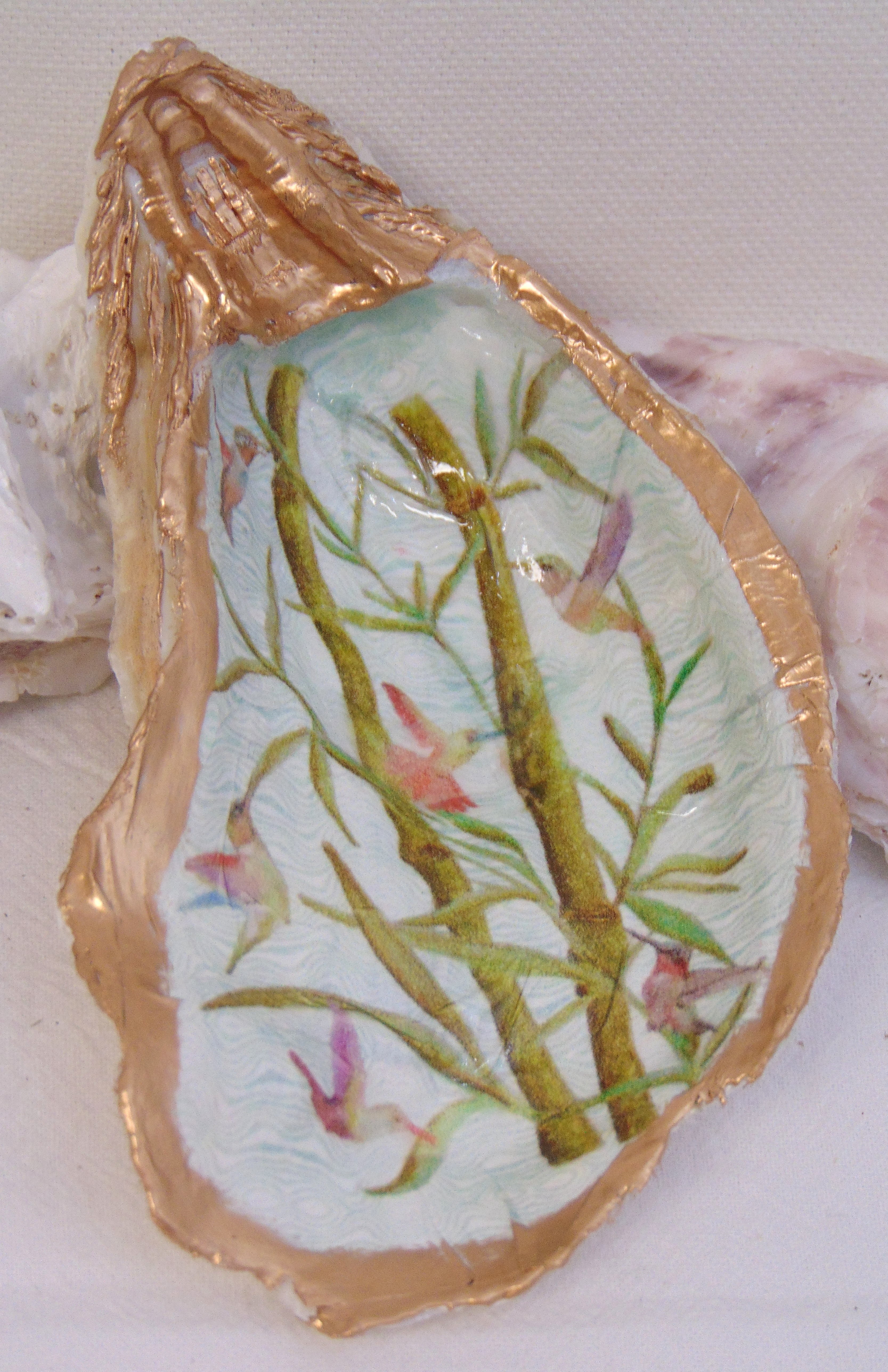 Watercolor Bamboo Hummingbirds Oyster Shell Jewelry Bowl