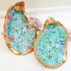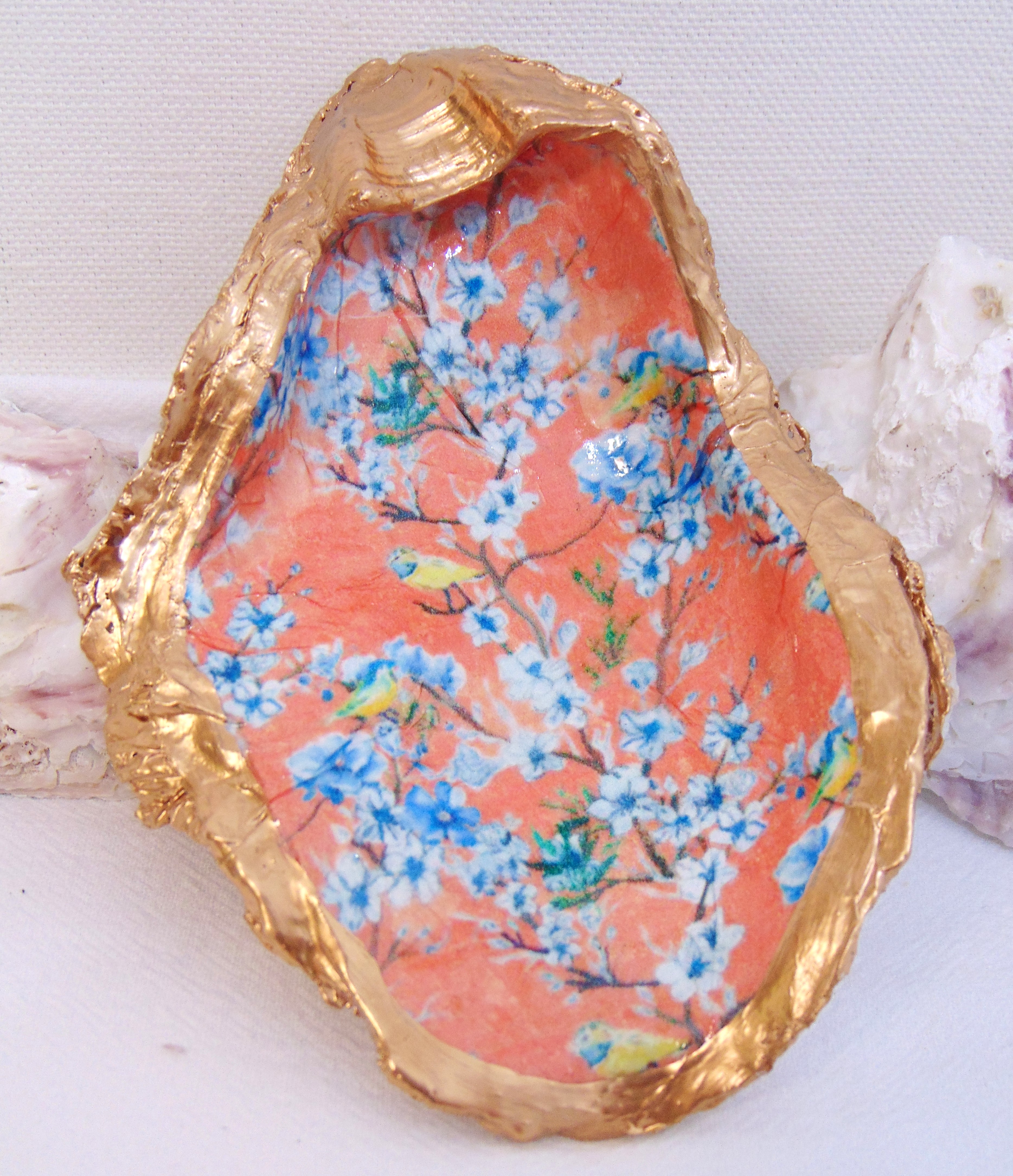 Watercolor Battery Blossoms Blue on Coral Oyster Shell Bowl