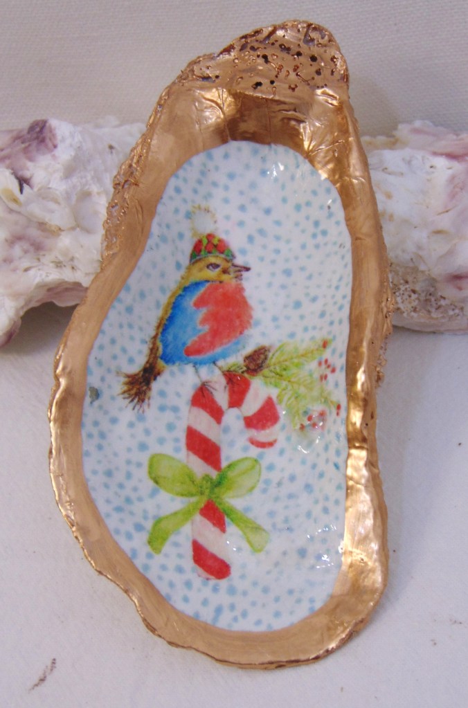Watercolor Candy Cane Birdie Oyster Shell Jewelry Bowl