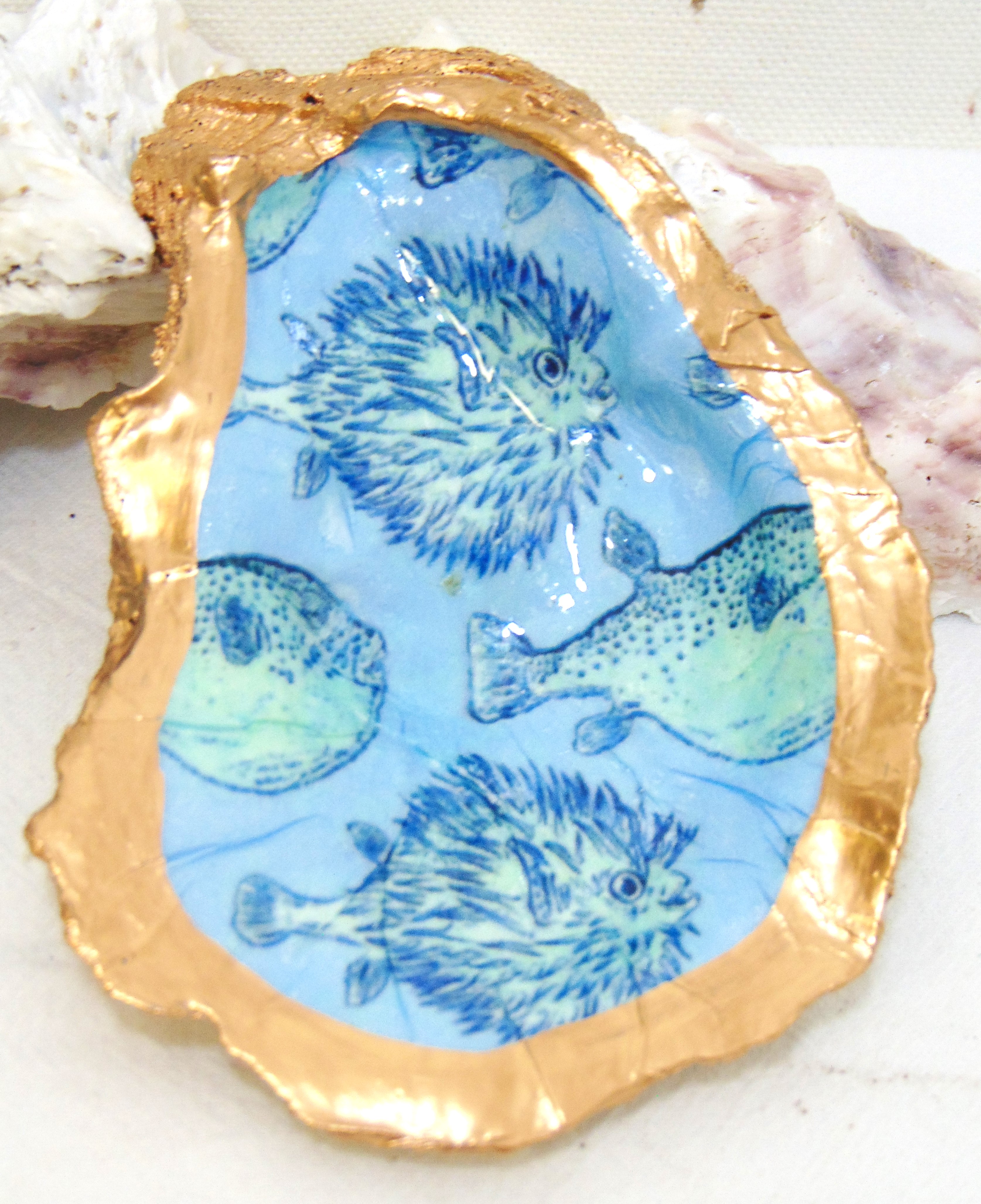 Watercolor Puffer Oyster Shell Jewelry Bowl