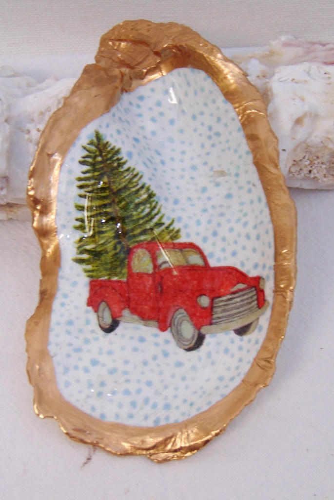Watercolor Red Truck And Tree Oyster Shell Jewelry Bowl