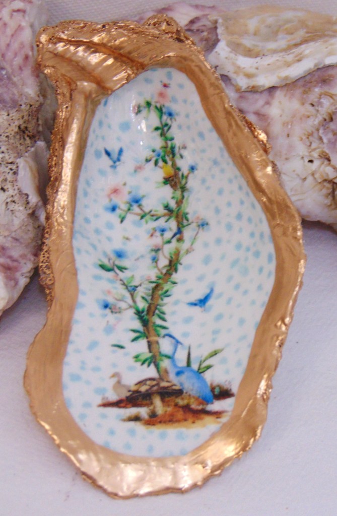Watercolor Tall Heron Chinoiserie Oyster Shell Jewelry Bowl